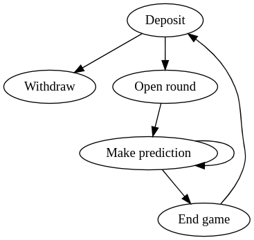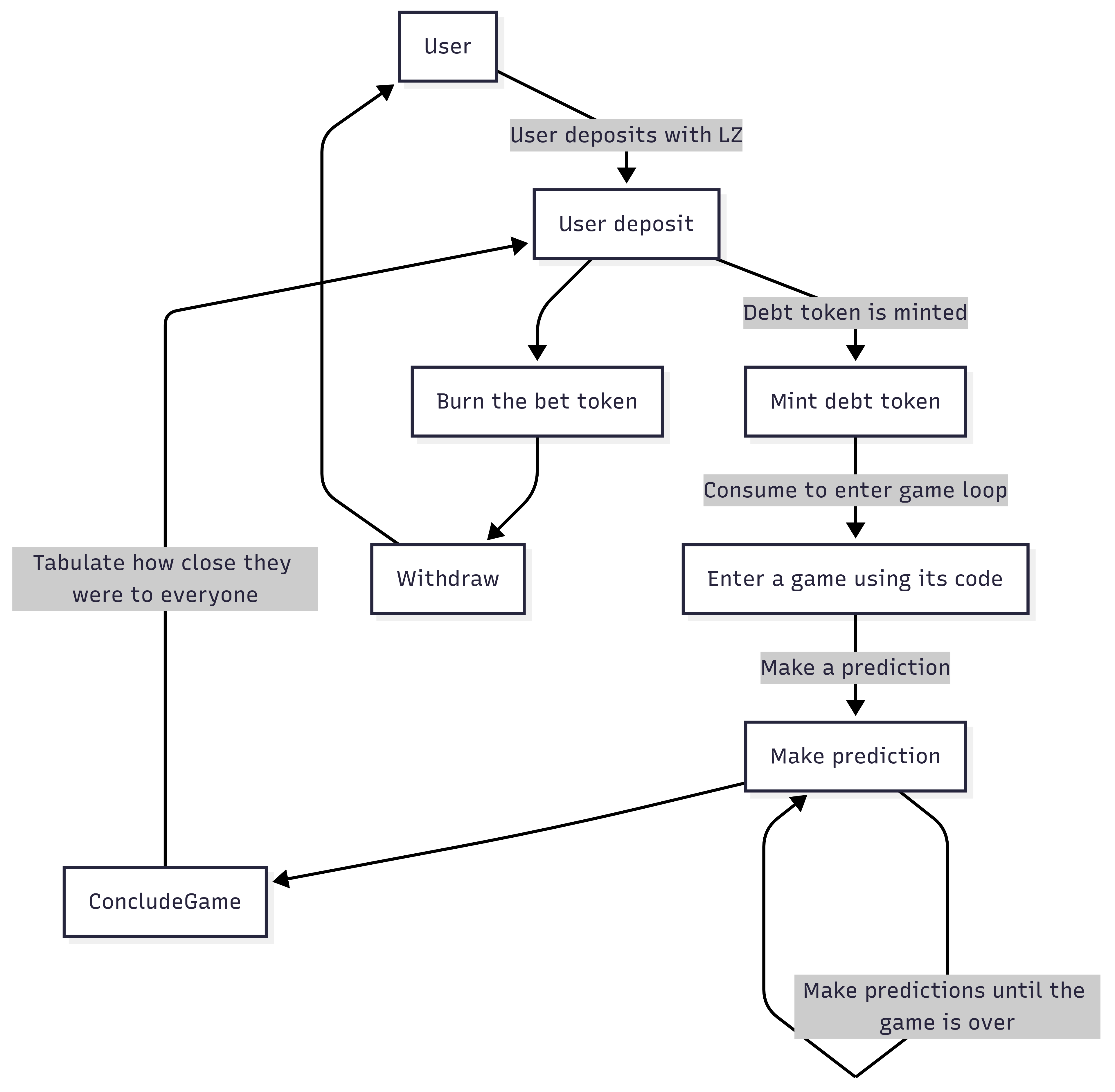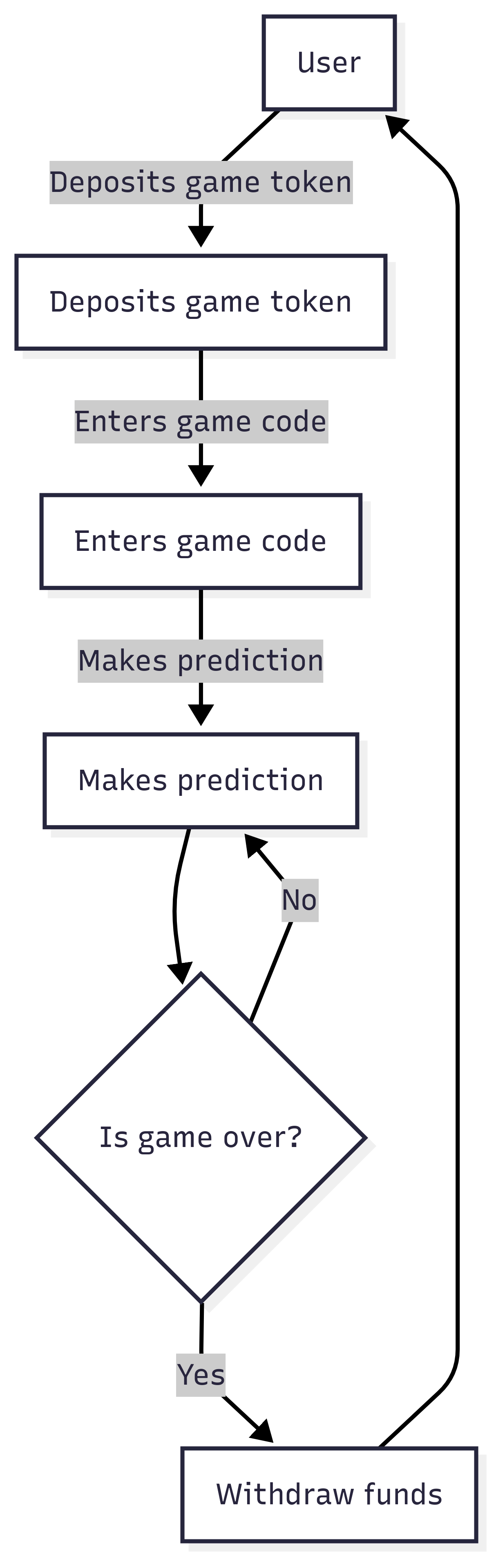 So basically, a user opens the game, makes a prediction alongside everyone else, then they aggregate everyone’s predictions. The user plays back and forth inside the “Makes prediction” stage, dependent on some state, then the user withdraws their funds from the contract.
