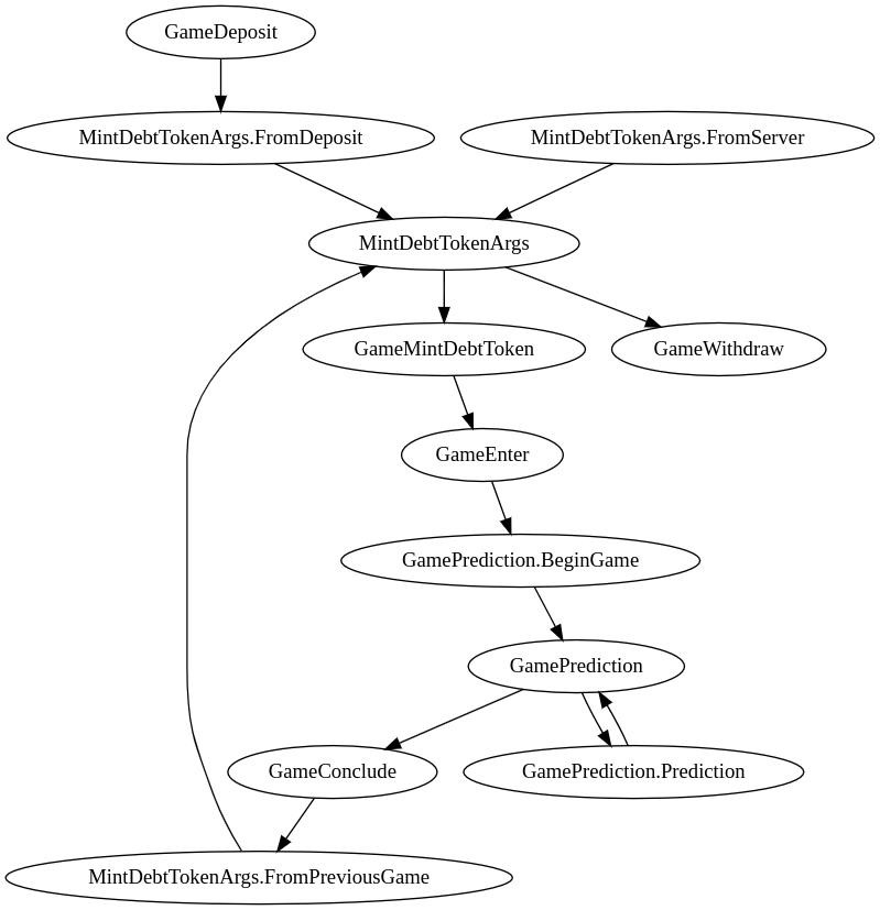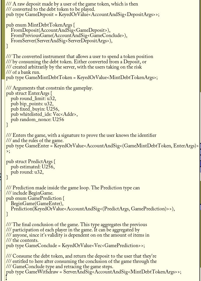 Creating a recursive game playing type 🔁🎯 for the contract. Since this is a state channel/validium/rollup, depending on your nomenclature use, we'll be compressing a recursive structure for submission on-chain to trigger side effects. We will use a UTXO style of optimistically consuming Layerzero 🌐⚡ on the server side, and deposits with a debt derivative 💰📈 for a frictionless user experience.