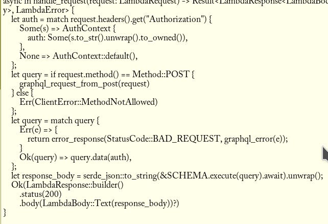 These types resemble the schema from above. In other places, we set up a database pool that we use with Postgres, and later in the code we have the implementation for the looking up of these values. We also start to define an entrypoint inside the Lambda graph to run inside AWS Lambda: