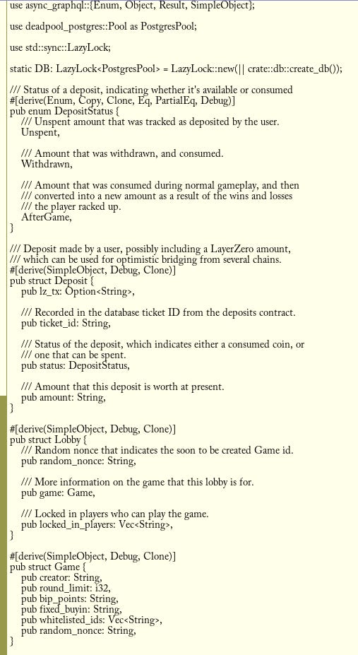 We start to implement the backend by generating a GraphQL schema consistent with the type we defined above. In our game, the server functions more like a storage backend for the signatures as they’re aggregated (and some validation mixed in to save time for the client, including checking deposits when they’re spent), with the frontend dressing up what’s available to be presentable in a format consistent with a game.