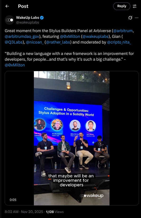 At Arbitrum Day, the mood was electric. It was great to name so many faces! WakeUp Labs spoke at a panel on Stylus, which was really great.