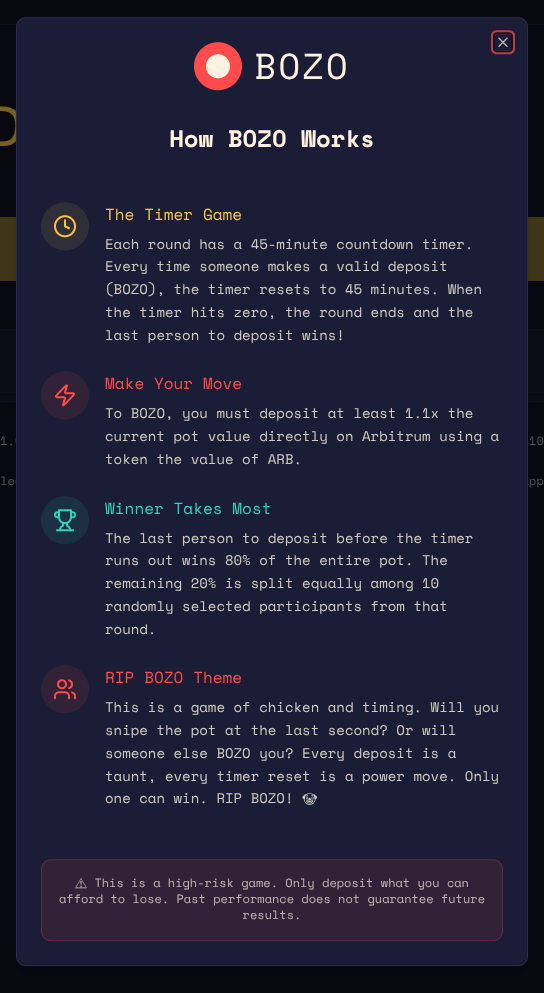 RIP BOZO is a defi game of chicken where the rules are simple: be the last to deposit when the time runs out, and win everyone’s deposits. I developed this as a fun little show and tell for bobcat-sdk, and it lives fully open source in the examples directory. The code includes the graph that takes comments, the webapp, and the contract code. The game is powered by USND, the stablecoin by Nerite by CupOJoseph, a decentralised algorithmic stablecoin for the Arbitrum ecosystem.