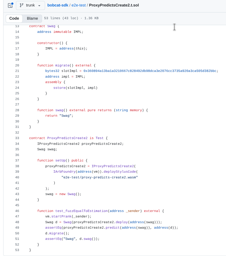 The tests in the broader bobcat-sdk repo include fuzzing, with this example being testing an exotic permissionless upgradeable proxy, which we titled the metamorphic migration pattern. This is such a great tool for testing Stylus contracts in the real world!