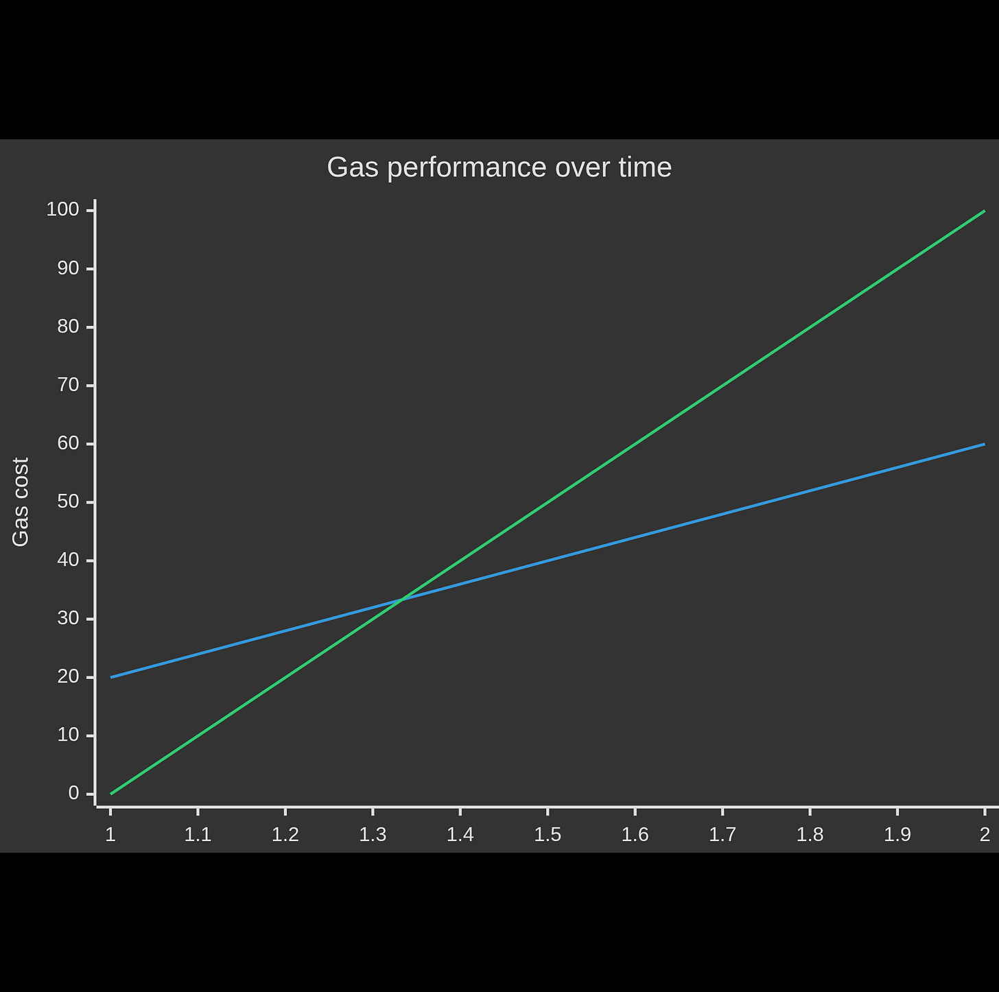 Where the blue line is Stylus, and the green line is Solidity. Source? It came to me in a fever dream. This is how I internalise my thinking with the setup and gas costs of Stylus.