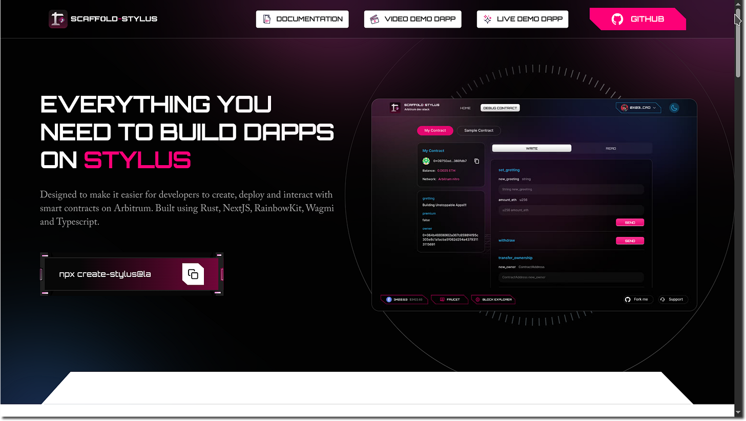 Scaffold Stylus is a project creation tool for a number of contracts and frontends, including a simple ERC20, a ERC721, Chainlink Data Feeds, and Chainlink VRF. They also provide a block explorer for local development, and a Wagmi frontend for interacting with the contracts made using their platform!