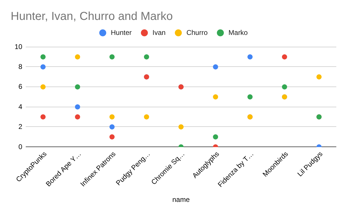 CryptoPunks,Bored Ape Yacht Club,Infinex Patrons,Pudgy Penguins,Chromie Squiggle by Snowfro,Autoglyphs,Fidenza by Tyler Hobbs,Moonbirds,Lil Pudgys